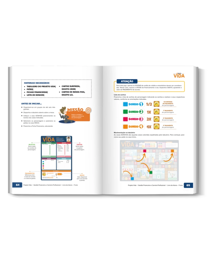 Por meio de um jogo de tabuleiro, as situações demonstradas são baseadas em desafios reais, icentivando os alunos a explorarem, refletirem, decidirem e aprenderem com suas escolhas e consequências.